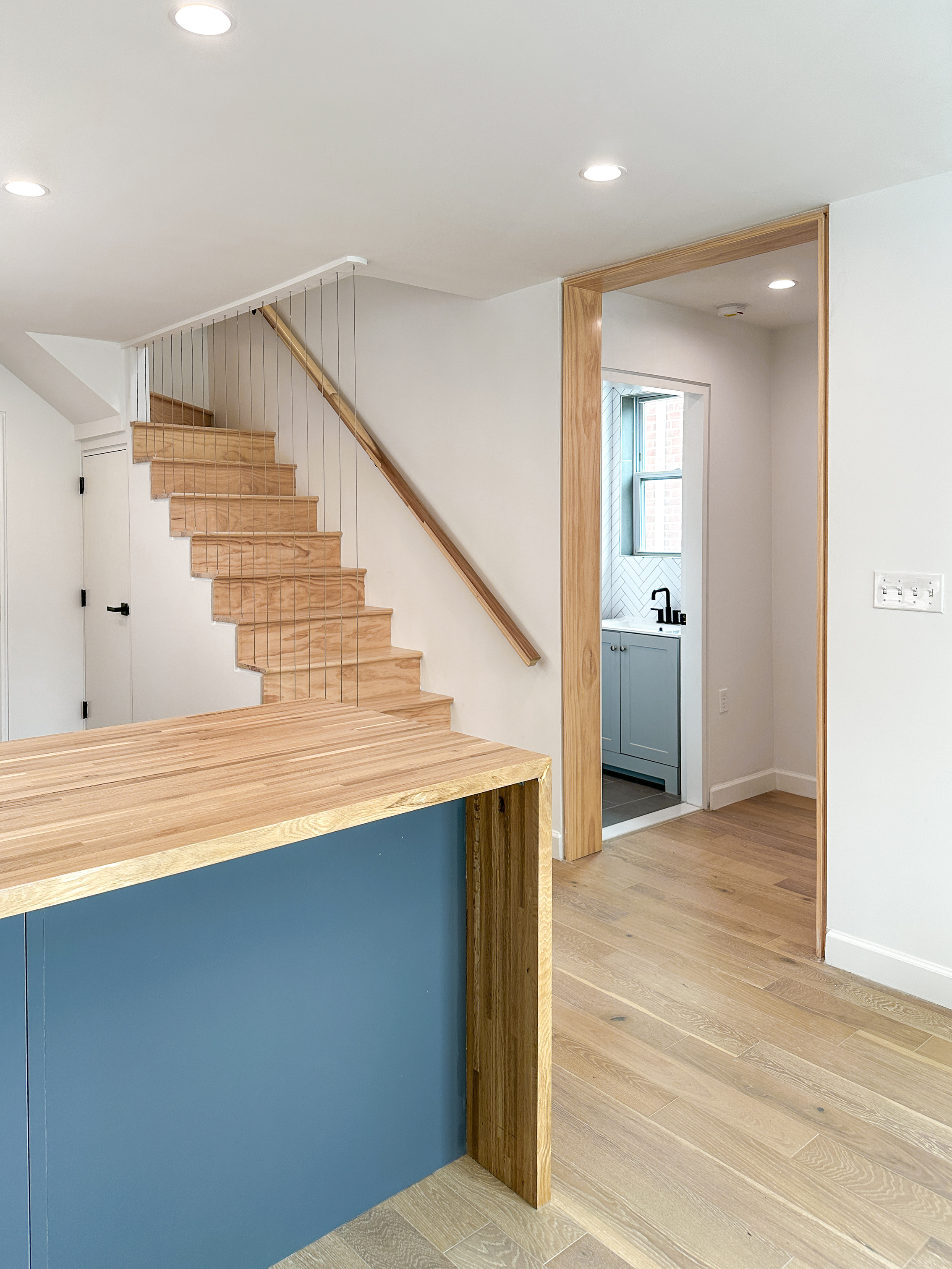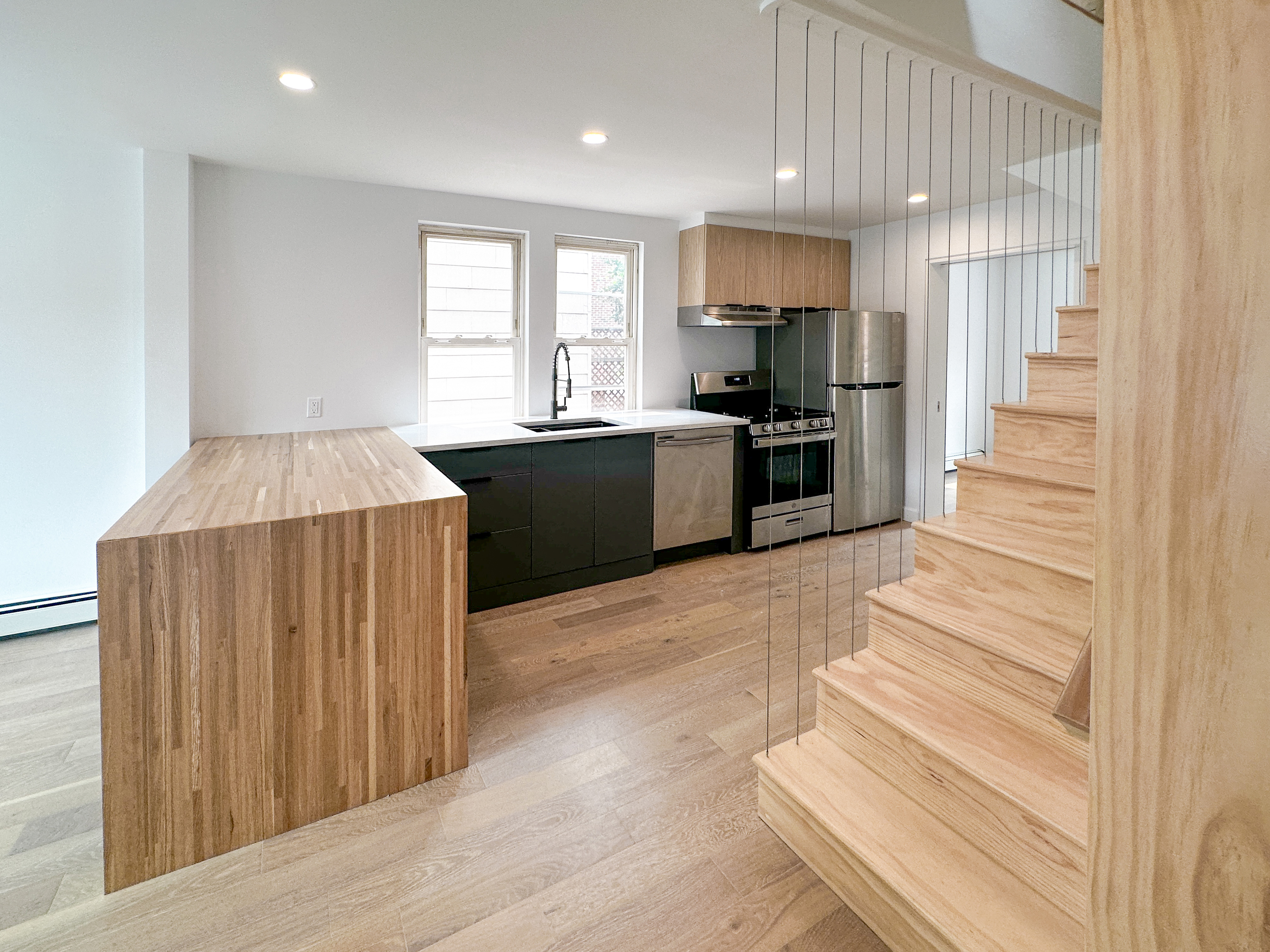 This comprehensive renovation transforms an urban residence into a modern sanctuary, merging clean lines and contemporary finishes with functional design. The heart of the home, the kitchen, features sleek cabinetry and state-of-the-art appliances set against natural wood accents that evoke warmth and style. The open plan layout ensures that natural light floods the space, enhancing the airy feel and connecting the living areas seamlessly for a fluid living experience.
